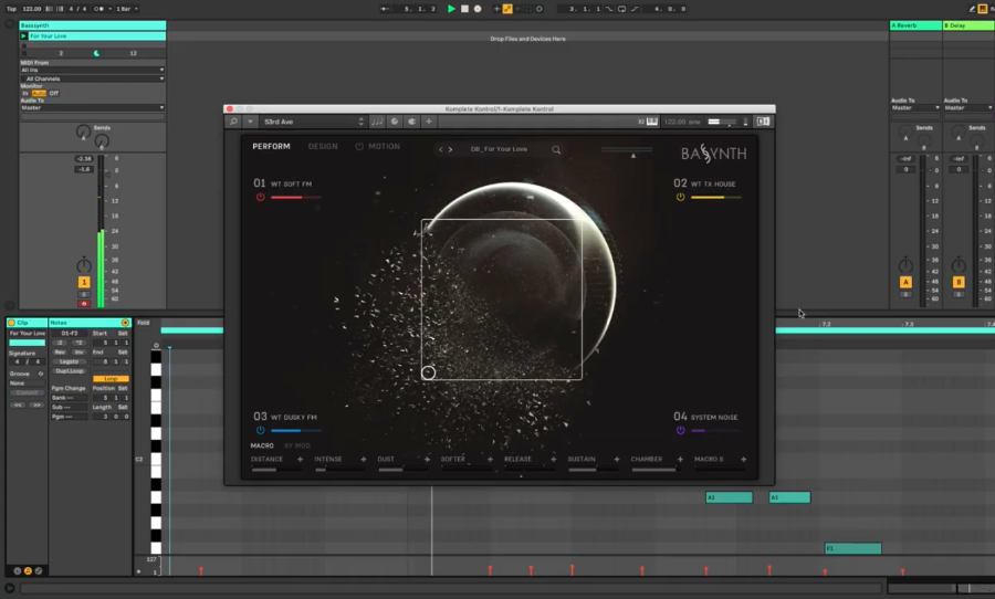 The first major section of the plugin is Perform. Flick through BasSynth’s juicy sounds while the four layers of each sit in each corner. You can change the level and on/off of each layer, adjust the 8 macros and play with the intricate XY modulation morph square. Inside the Design tab you will be able to create and tweak the most organic bass tone using the engine, tone and mix controls.