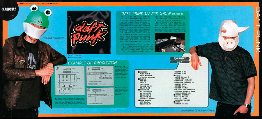 The below image seems to come form a Japanese magazine feature, evidently before Daft Punk put on the helmets in 1999. In accordance with the band’s mythos, they received significant studio upgrades going into Discovery, so what you’re seeing below is a very early glimpse at how everything came together.