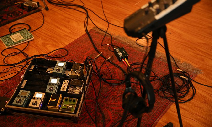 These days I’m trying to use as little as possible. I’m running three guitar signals, so that can get out of hand pretty quickly on a pedalboard. I’ve never had particularly good gear and I’ve grown kind of fond of the limitations of lower end effects and how the shortcomings just become part of the overall sound. These days I have a bunch of Zoom Multistomps. One Zoom per channel, a fuzz, and a volume for the swell.