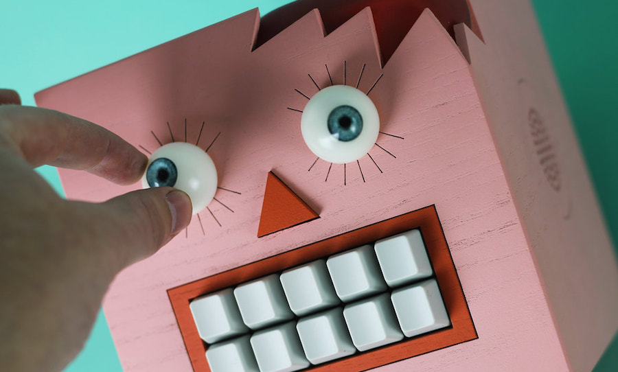 Mr Typo is the latest design by Love Hultén, an expert craftsman who usually makes beautiful handmade devices. This one, however, is not so beautiful. It’s a wall mounted speech synthesiser that regurgitates text-files in irregular sentence structures, using Markov chains on a Rasberry Pi computer. Oh yeah, and ‘it’ doesn’t have a keyboard.