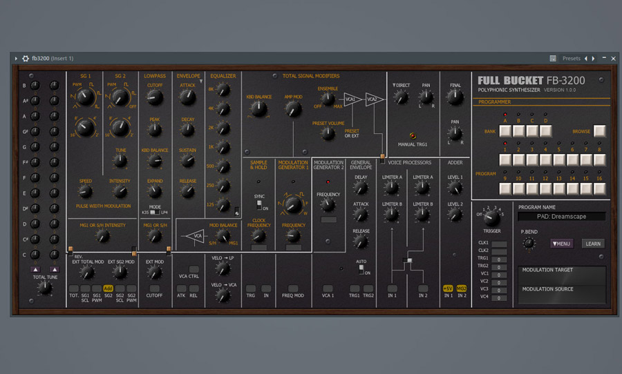 The FB-3200 from Full Bucket Music is a virtual emulation of the Korg PS-3200. This semi-modular polysynth is available as a free download.