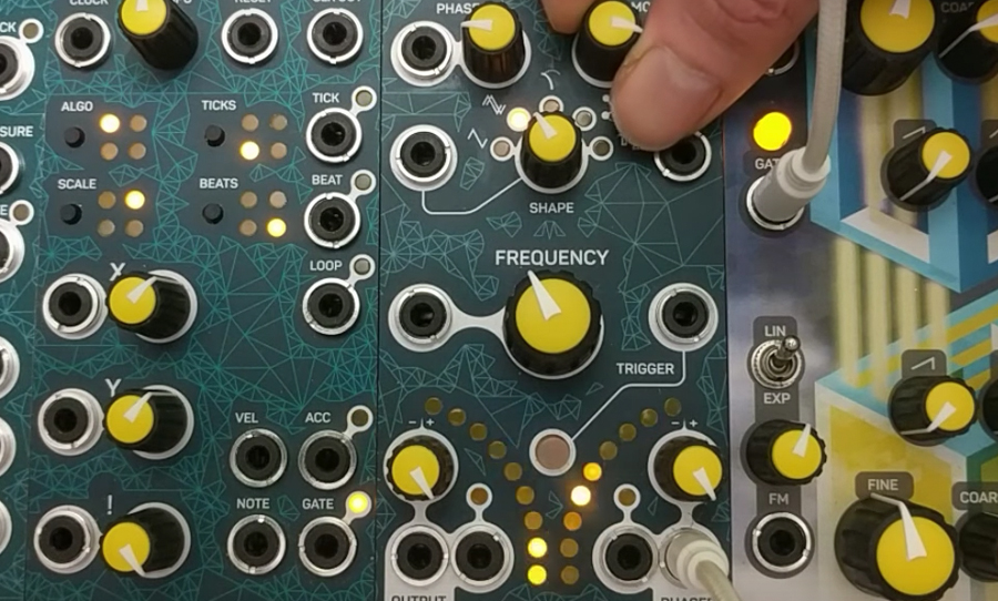 The mod knob controls the shape specific modulation and the frequency knob controls the rate at which it oscillates. Being a dual output device, there are interesting ways that you can create phasing effects, with two LED arrays displaying the generated CV levels of each output.