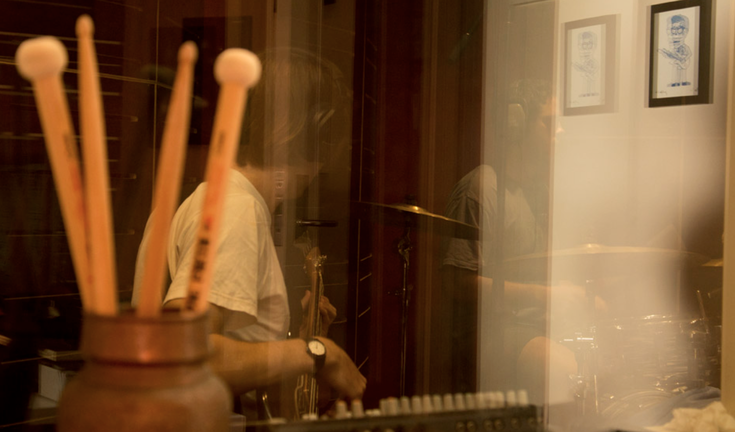 A view into the live room from our control room. Copper stick holder courtesy of my grandfather from way back.