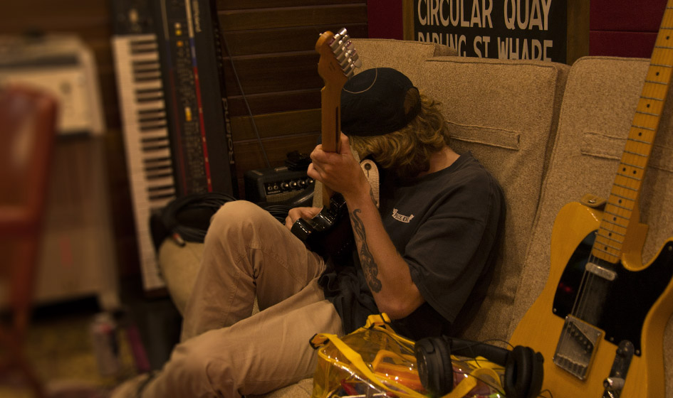 Chilling is just as important as sweating it out with cans on during a session. Eli getting some R&R on our street found couch. We encourage plenty of coffee, a good breakfast, an even better lunch and not being afraid of getting into the right headspace before hitting recording. If that means ciggies and beers (or any other substance for that matter), then it has to be done.
